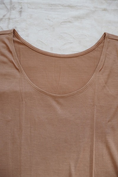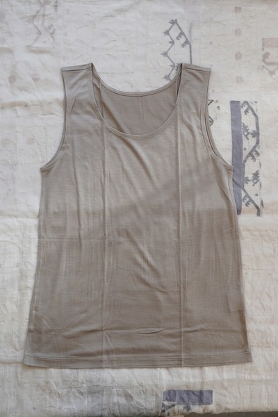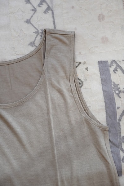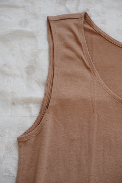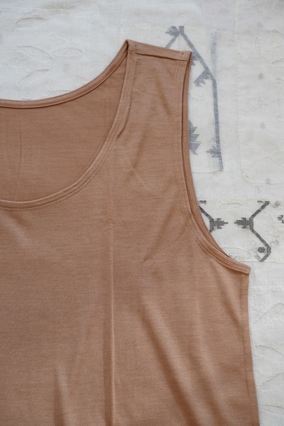 春夏はアウターとして、秋冬はキャミソールよりも暖かさのあるインナーとして着まわせる便利なタンクトップ。 アームホールとネックラインはつまりすぎず、身幅は少しゆったりとしたつくりです。ブラジャーの肩紐もきちんと隠れます。