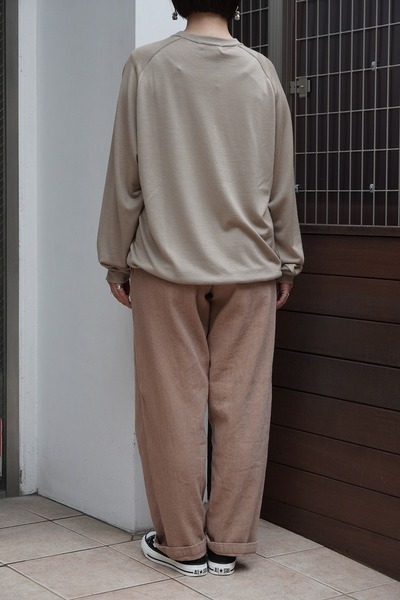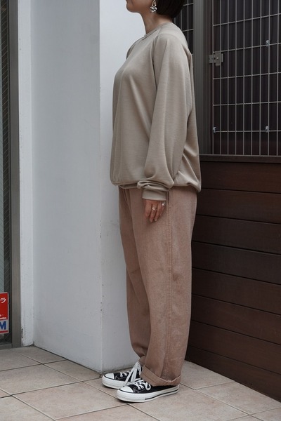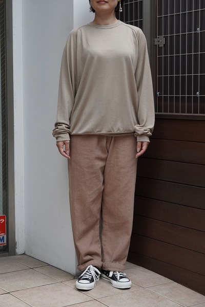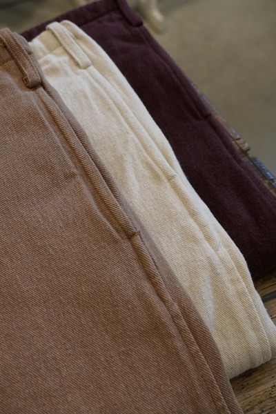 軽やかでありながら、程よい張りを感じさせる生地感は、季節を問わない日本の四季に合わせた日常着。仕上げには天然の縮絨加工を施し、素材そのものの表情を引き出すとともに、手間と時間を惜しまず丁寧につくりあげることで、「無垢」ならではの洗練された風合いが完成します。