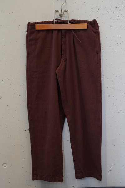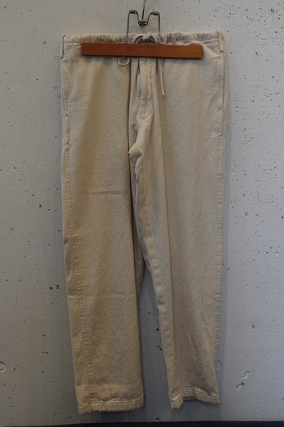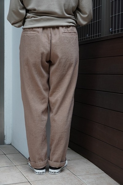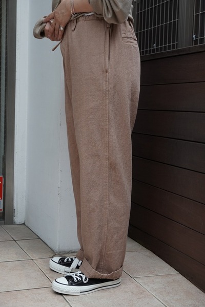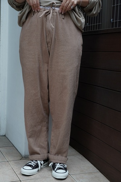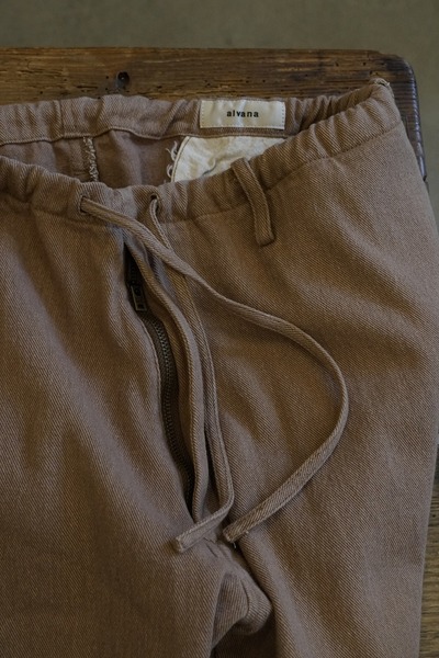 alvana 定番イージーパンツ alvanaの定番として展開され、高い評価を得ているイージーパンツ。 ウエストから膝にかけて自然な膨らみと丸みを持たせ、裾にかけてわずかにテーパードを効かせた、綺麗さとバランスが取れたシルエット。 ウエストはドローコード仕様を採用し、ややゆとりのあるサイズ感を紐で絞ることで、 リラックス感がありながらも、どこか上品で洗練された印象に仕上げています。 無駄のないデザインと、シルエットの良さが融合した一本は、 ジャンルやスタイルを問わず、幅広い服装に自然と馴染みます。 定番のワードローブとしてぜひお愉しみください。 *カットソーやTシャツなどをタックインしやすく、さまざまなトップスとも合わせやすいデザインのパンツです。