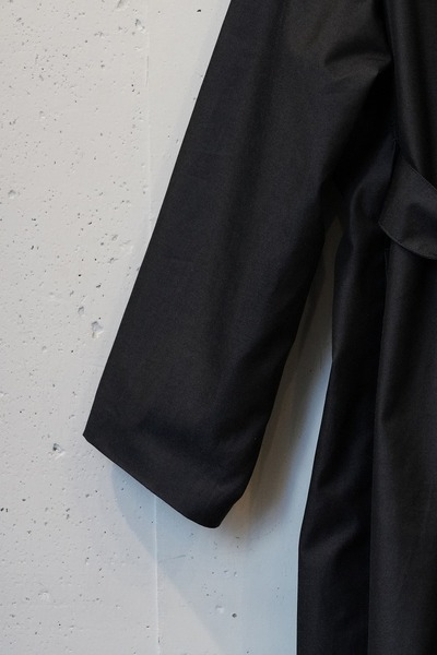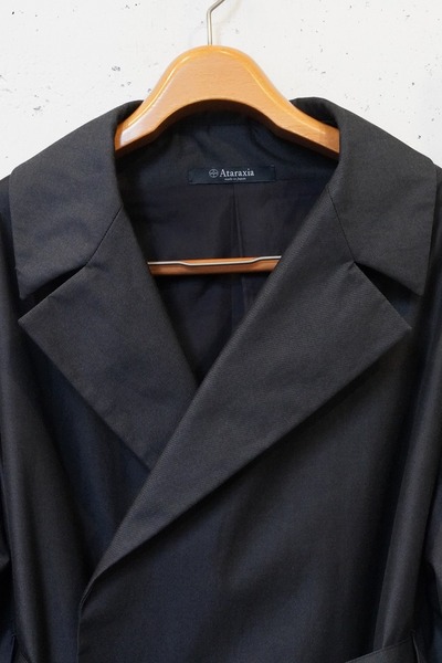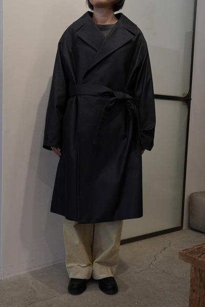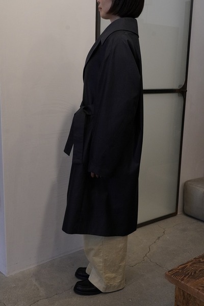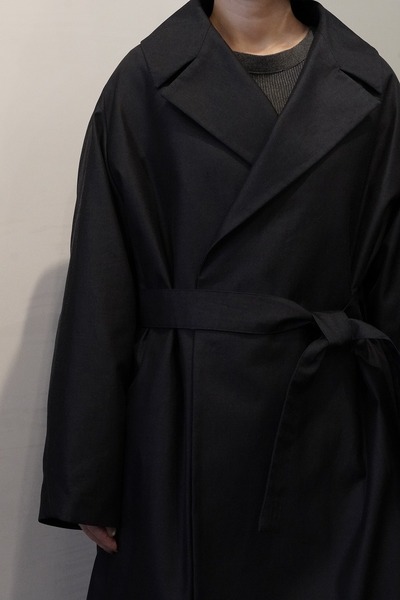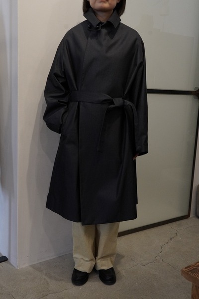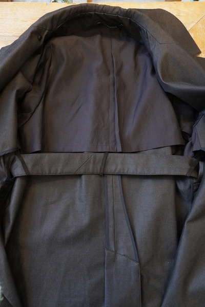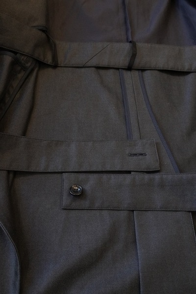 ープを内側にも外側にも出すことができる可動仕様にしています。フロントだけでベルトを締めたり、後ろからベルトを締めたり、いかなるようにもできます。羽織るだけの着こなしの場合は、内側のベルトループにベルトをすべて通して、ベルトを中にしまうことができます。