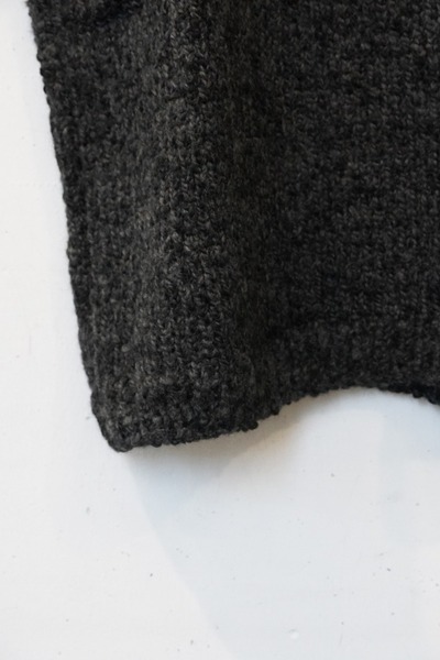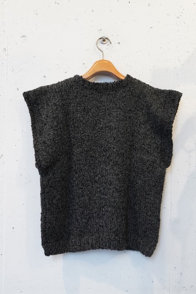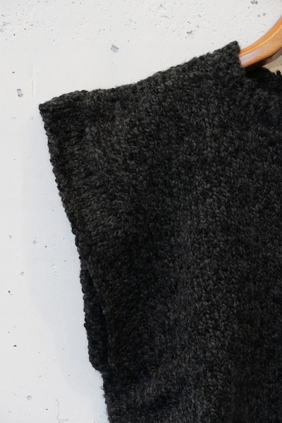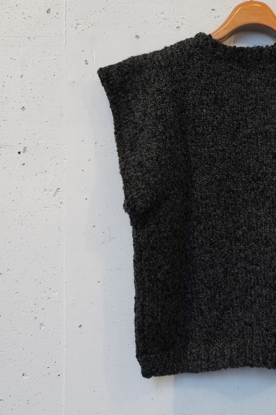 オーバーサイズのチャンキーベスト、またはプルアンダー。オーガニックウール50%、アルパカ50%、不規則な質感のチャンキーヤムを使用。ざっくりと編まれたふっくらとしたボリューム感が特徴で、見た目よりも軽い着心地のニットベストです。独特な表情が魅力の1つ。温かみがあり、秋冬の重ね着スタイルに重宝してくれます。オーバーサイズのシャツと合わせてもきれいめにもカジュアルにも着こなせますし、タートルネックを合わせると上品な印象に(^^)タイトなカットソーと合わせることですっきりとしたメリハリのある着こなしになります。ボトムスはデニムやきれいめなパンツなどと組み合わせても素敵です。