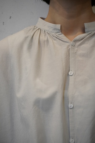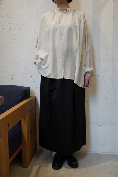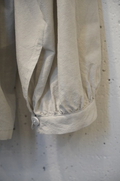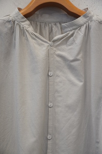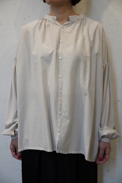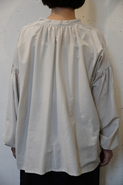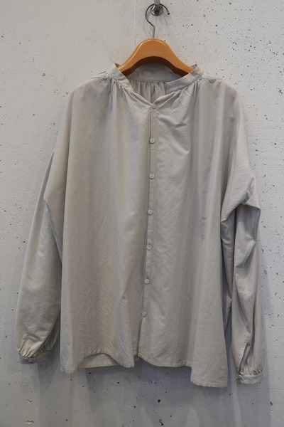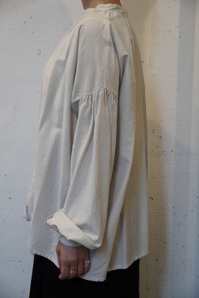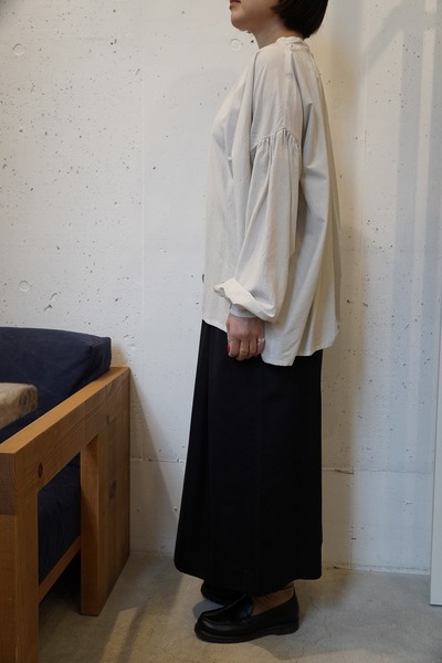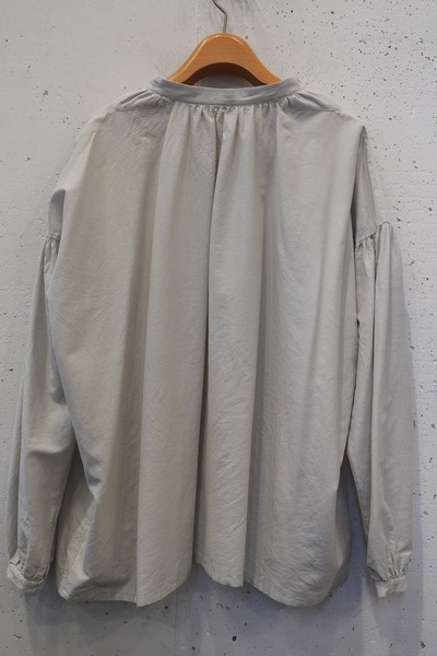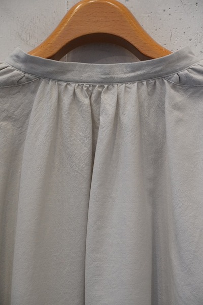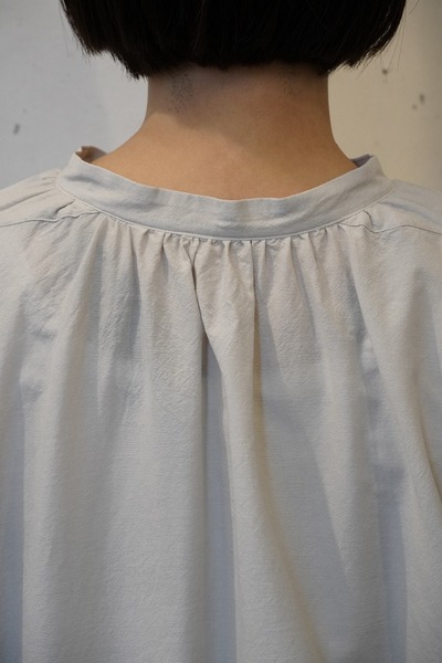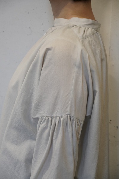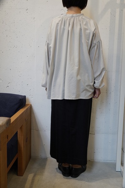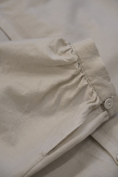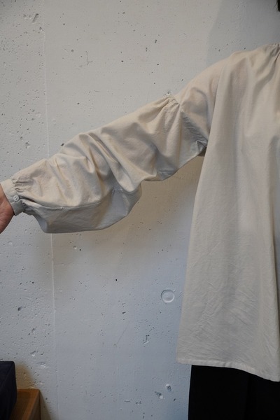 襟元やアームにたっぷりとギャザーを寄せ、膨らみのあるフォルムに仕上げたhumoresqueの不動の人気のブラウス。リピータの方も多い形です。