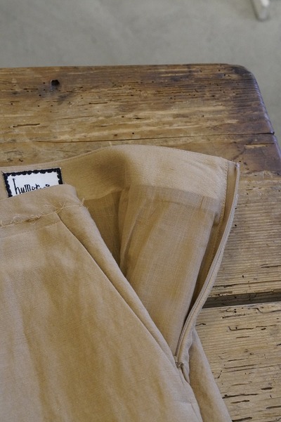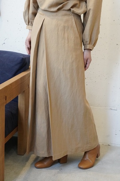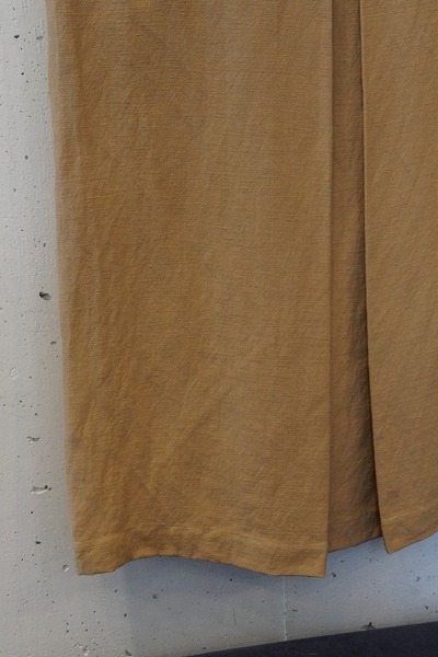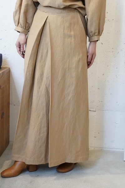ウエストからくるぶしまでゆったりと落ちるクリーンなラインは、どんなトップスを合わせてもすっきりとまとまります。大きめのプリーツを入れることで長めの丈にある動きにくさを解消しました。ウエストには裁ち切りのディテールを効かせるなど、細やかな仕立ての技術も光ります。