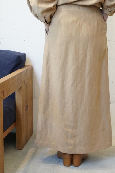 素材は、縦に中太番手シルク、横に中太番手のリネン糸で密度を甘めに織ったリネンシルクを使いました。リネンのソリッドな表情にシルクならではの静かな品の良さが見え隠れして、膨らみがありながらも軽い感触が特徴です。肌に触れる面には加工をしてピーチタッチに仕上げていますので、素肌でも心地よく感じられます。肌に馴染むほどに柔らかさが増し、風合いに深みが生まれるので、長く愛用するほど自分だけの1着へ育ってゆく過程も楽しんでいただける素材です。