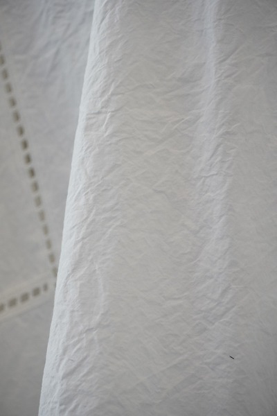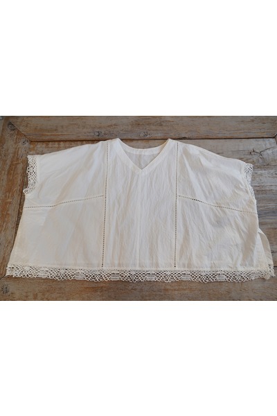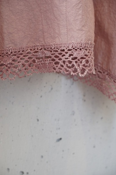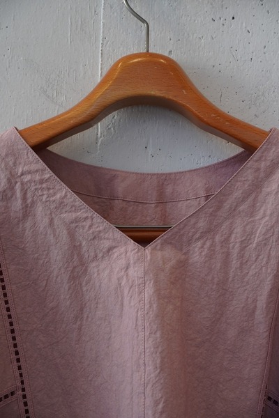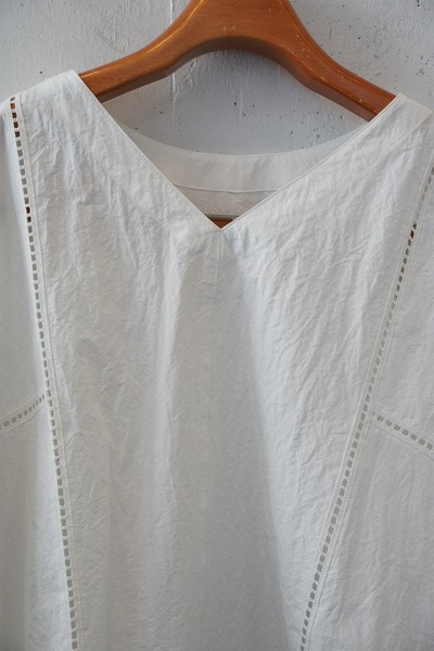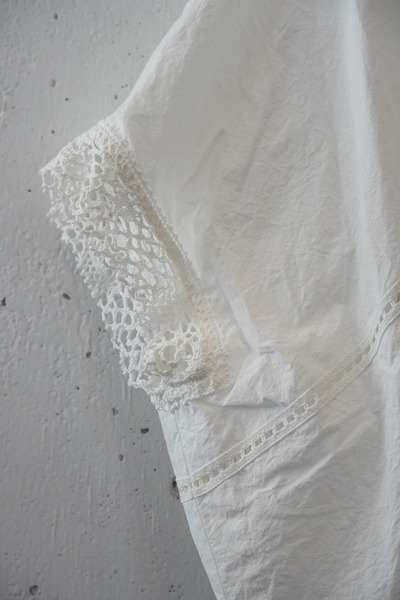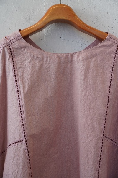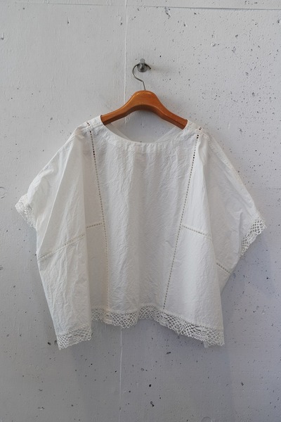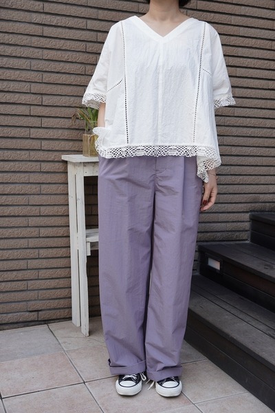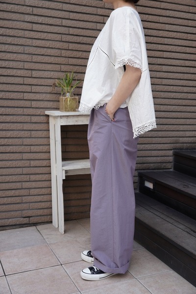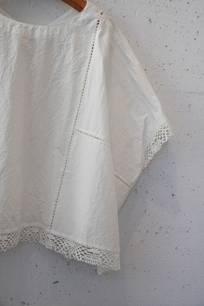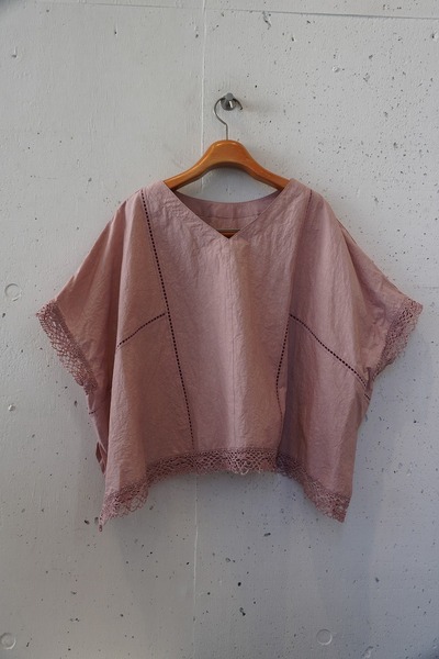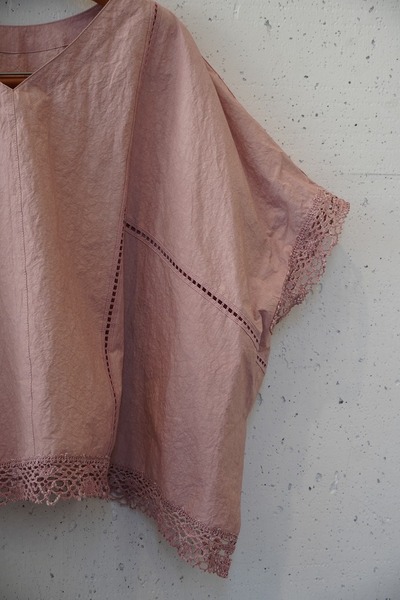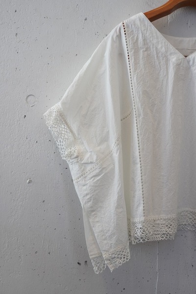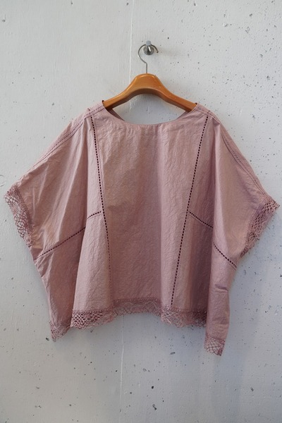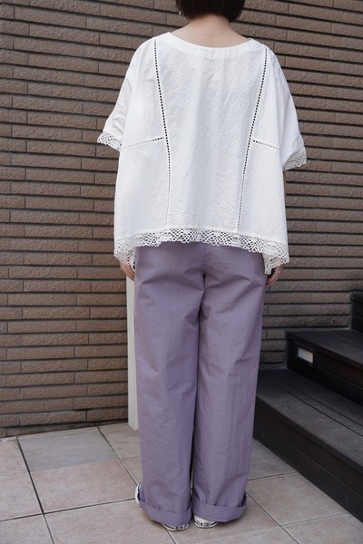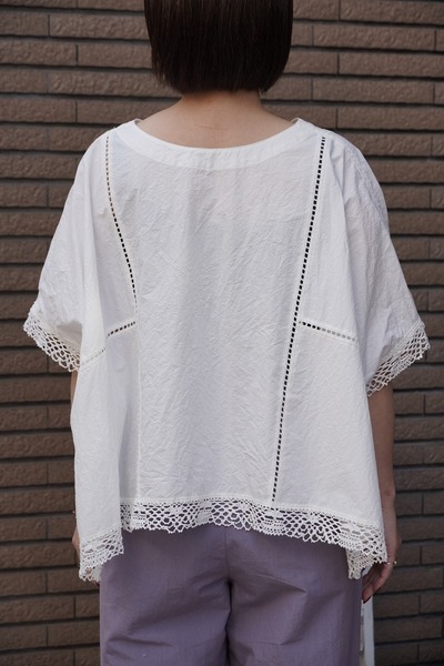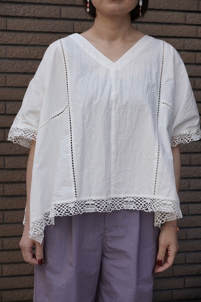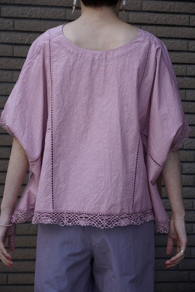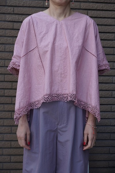 綿✕リネンの天然素材の持つ豊かな表情を自然なシワ感と染ムラで表現したタイプライター。ハリ感があり、肌に張りつきにくい生地で夏でも着用しやすい生地。スラブ感のある綿レースを使用したワイドシルエットのポンチョブラウス。Vネックとボートネックの前後2WAYデザイン。コンパクトな着丈でボトムシルエットを選ばず、ワンピースの重ね着などにも◎