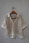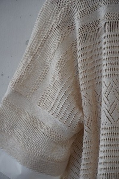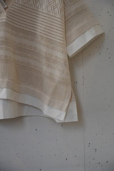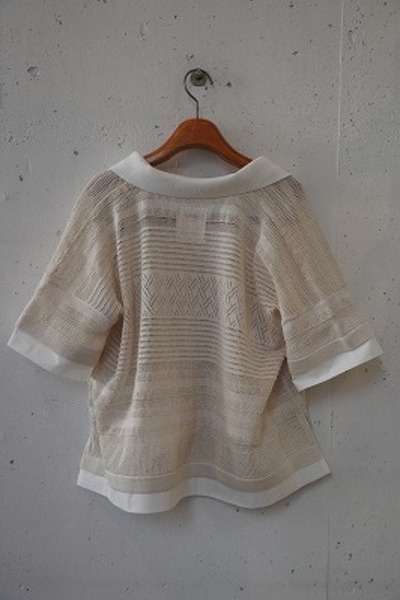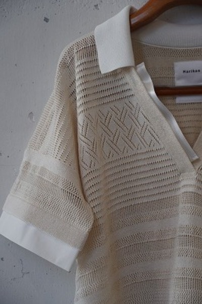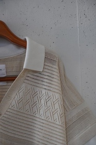 今シーズンのクルーネック同様、リネンの様なさらっとしている素材で、どの角度から見ても編地が美しいデザインのポロニットです。袖や裾がシャツの生地で切り替えられており、デニムなどシンプルなボトムス合わせたり、ワイドパンツなどボリュームのあるボトムスと合わせてもすっきりと見えて良いバランスです。編地から入る風も気持ちよく、涼しく快適に着ていただけます。