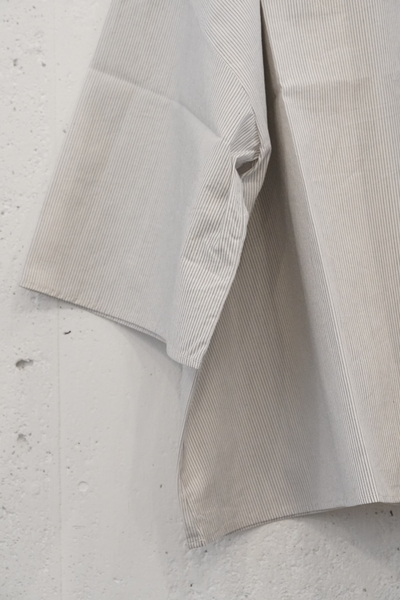 細いピンストライプが上品で大人な印象のテントラインシャツのご紹介です。さらりとしたコットン素材で、しなやかな落ち感があり、美しいシルエットです。身幅もゆったりしていますので幅広い体型の方に着ていただけます。春先はカットソーなど重ねて着ていただくのもいいと思います。袖や裾からふわっと風が通り抜けるのが心地良く、暑い夏も快適に着ていただけます。