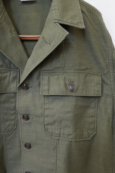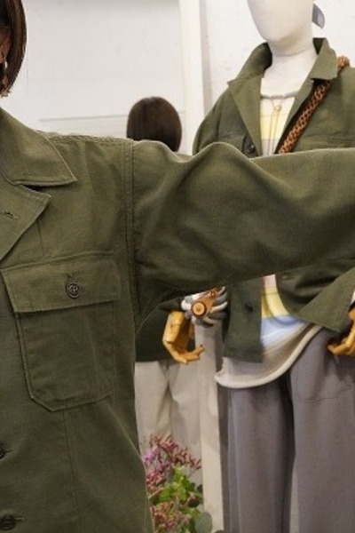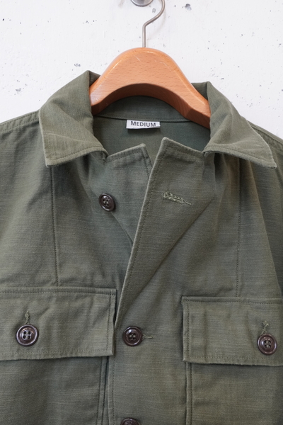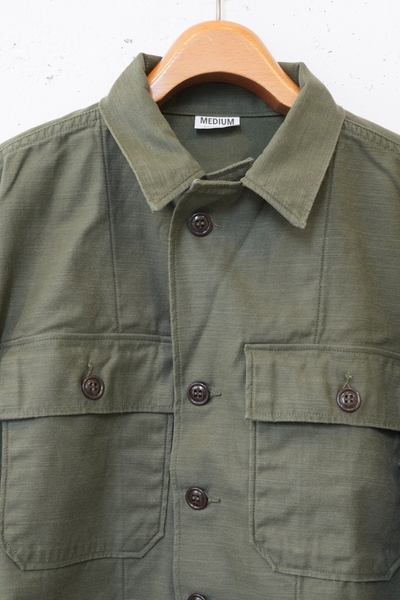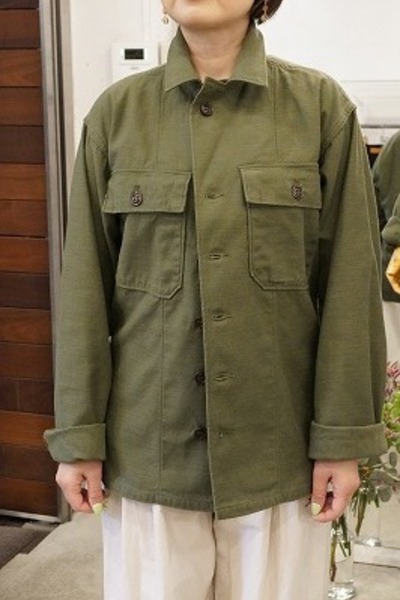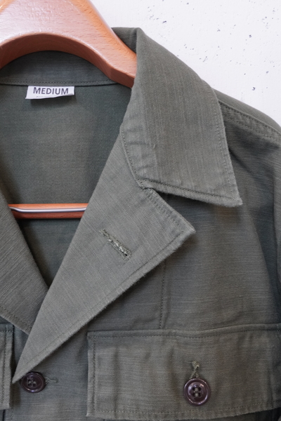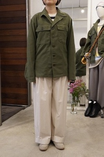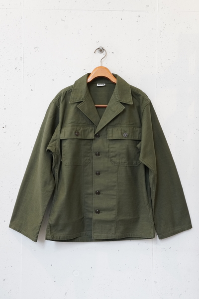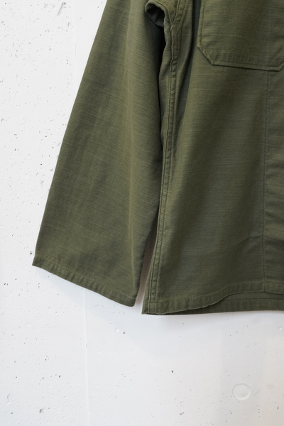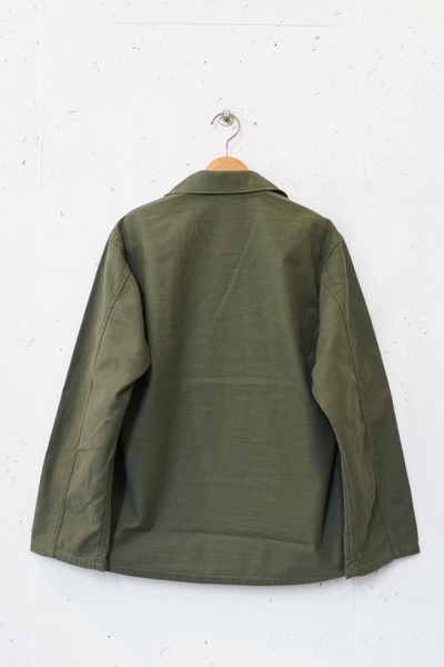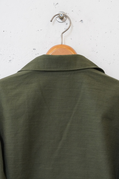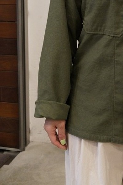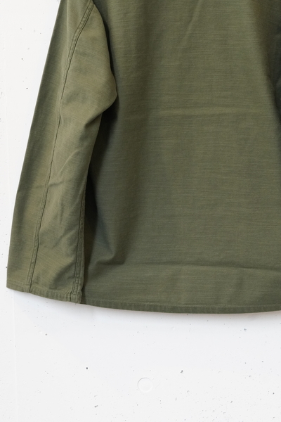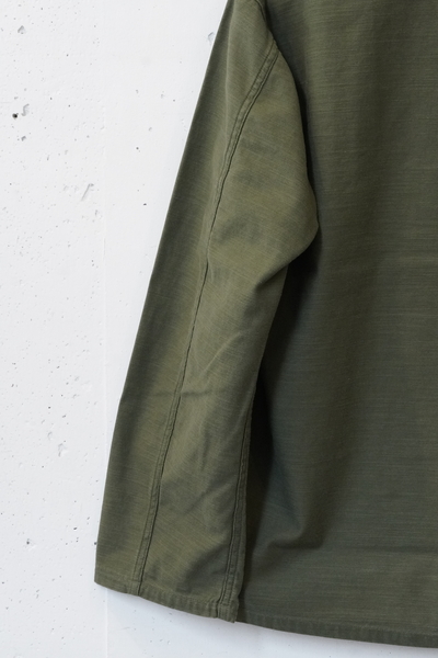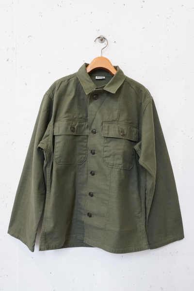 RESOLUTE(リゾルト)のデザイナー林 芳亨氏が監修したFAR EAST MANUFACTURING(ファーイーストマニュファクチャリング)のUTILITY SHIRT。バックサテンを使用したユーティリティーシャツ。筒袖と呼ばれるジャケットの雰囲気が色濃く残る1950年代のモデルがデザインソース。両胸にはフラップポケット。オリジナルで開発したバックサテンはスレン染めで洗濯や日光への堅牢度が強く、オリーブカラーを残しながら褪色。着るほどに体に馴染み、着用を重ねるごとに味わいが深くなる1着です