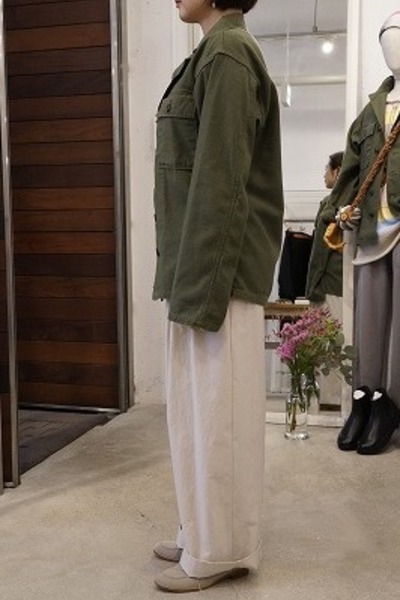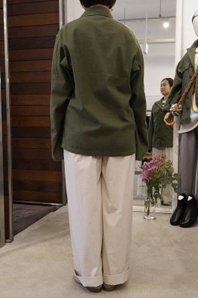 インナーにカットソーやシャツを着ても程よくゆとりがあり、シャツジャケットとしてアウター感覚で着ていただけます。袖はやや長めの設定になっており、くしゅくしゅっとまくっていただくと良いバランスです。秋口にはパーカーや薄手のニットの上にも羽織れて、シーズン長く活躍してくれます(^^)