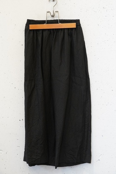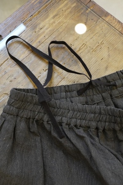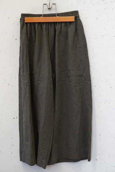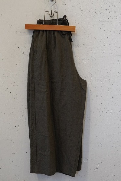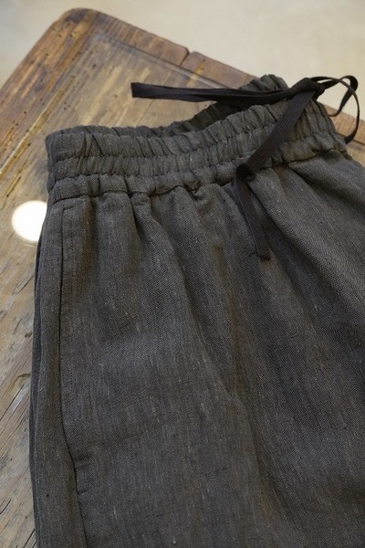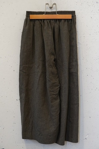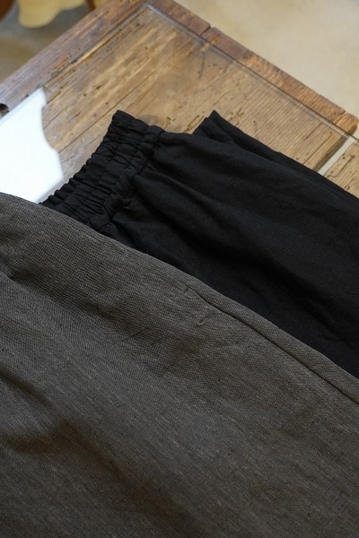 スカート見えするワイドパンツシルエットで、ウエストはゴム紐仕様でゆったりとした着心地です。生地の分量はたっぷりめですが、重さを感じません。縦横に違う番手のリネン糸で織られており、生地に表情があります。ぜひ店頭でご試着されてみてください(^^)